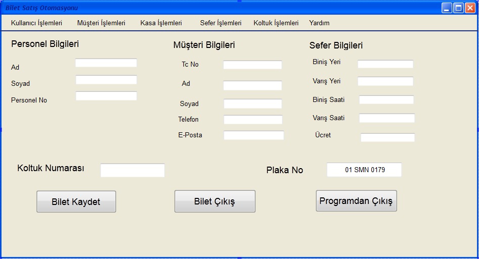 Her sey size bir tus dokunusu kadar yakin olup muekemmel ekran dizayni ile bilet satmak size hic zor gelmeyecek. Ister mause ister klavye ile tuem islemlerinizi yapin tek bir dokunus ile seferler hakkinda detayli bilgilere ulasin. Bilet satis otomasyonu uecretli olarak giris yapilan alanlarda oedeme araci olarak kullanilan bir sistemdirGiris noktasinda konumlandirilmis olan turnike sistemleri uezerine entegre edilen barkod okuyucularin satis yapilan barkodlu biletleri okumasi ve gecis izni vermesi seklinde calisirBilet satis sistemleri. Bu tuer hazir oedev veya kod istemek boeluem kurallarina uymuyor.